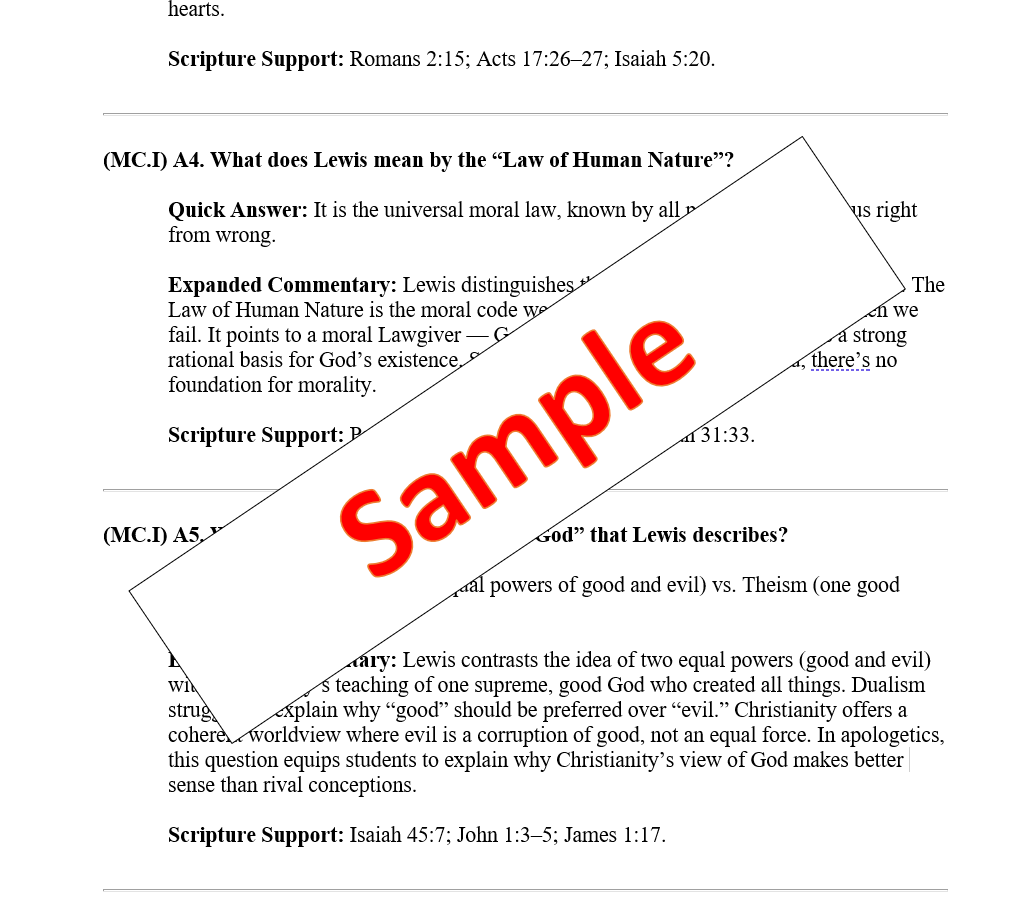 This curriculum introduces students to the foundational truths of the Christian faith through C.S. Lewis’s Mere Christianity, complemented by Cold-Case Christianity and other apologetics resources. With structured discussion questions, answer keys, and application activities, the program equips young believers to think critically, defend their faith with confidence, and apply biblical truth to everyday life.